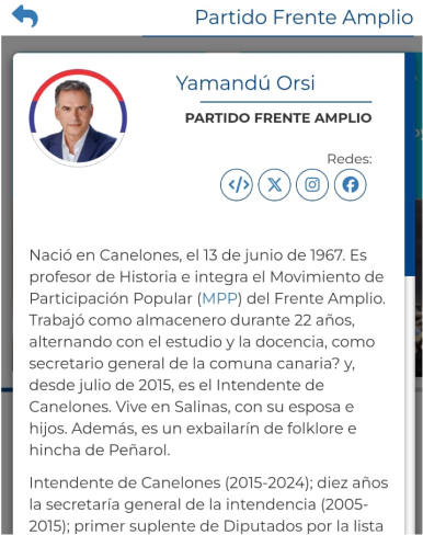 La información de los candidatos en un solo lugar: breve biografía, acceso a portal y redes sociales de los candidatos, noticias relacionadas especificamente, apoyos políticos y propuestas.